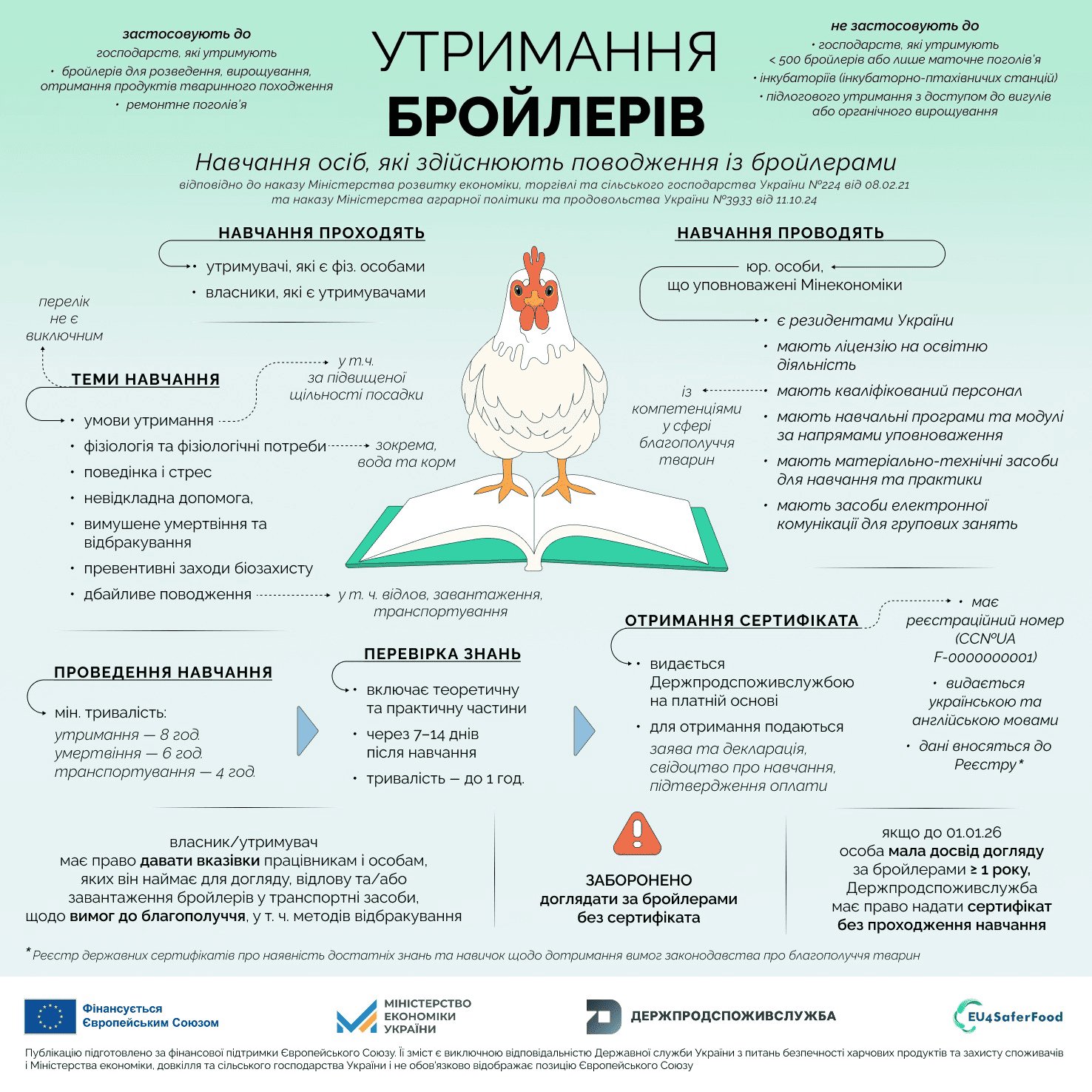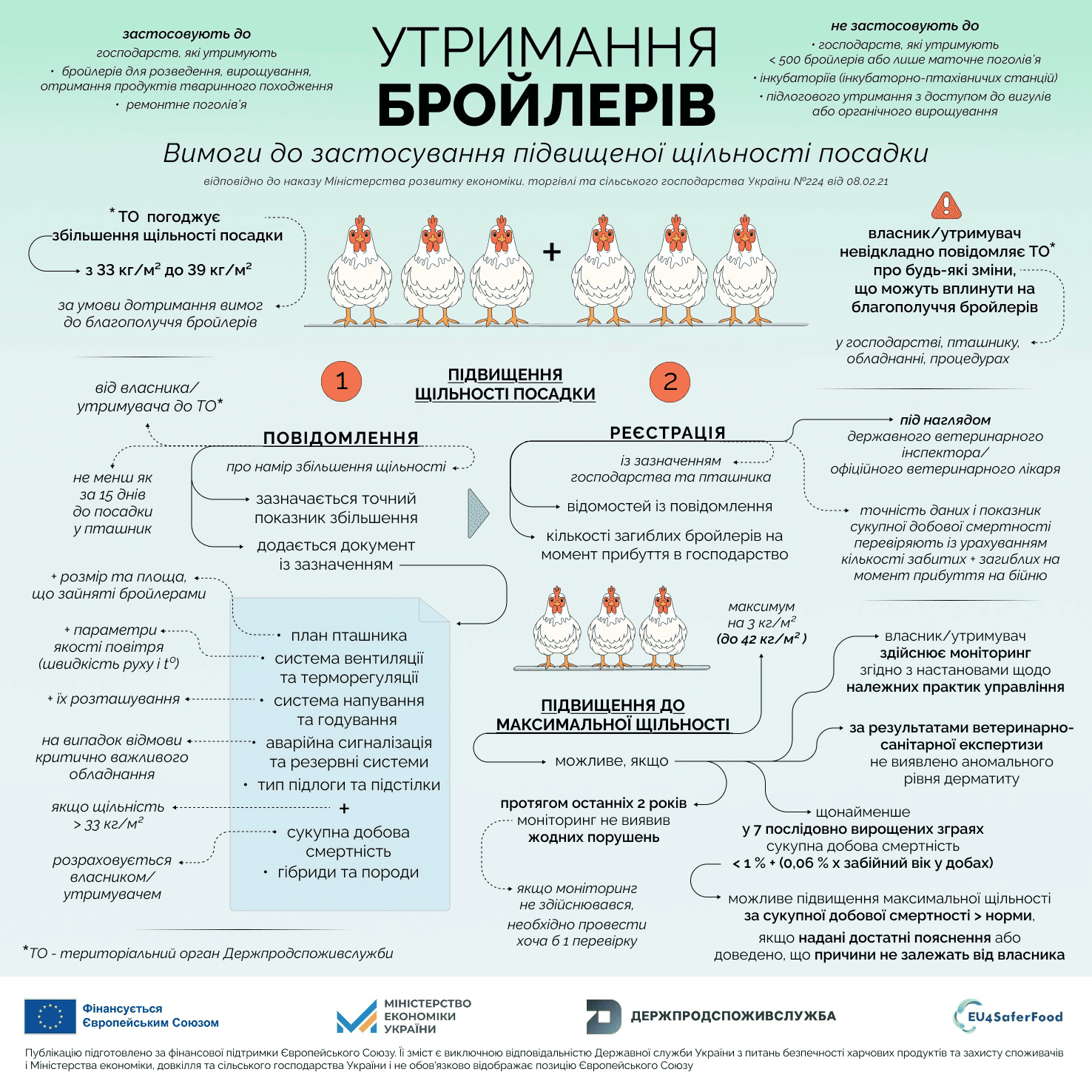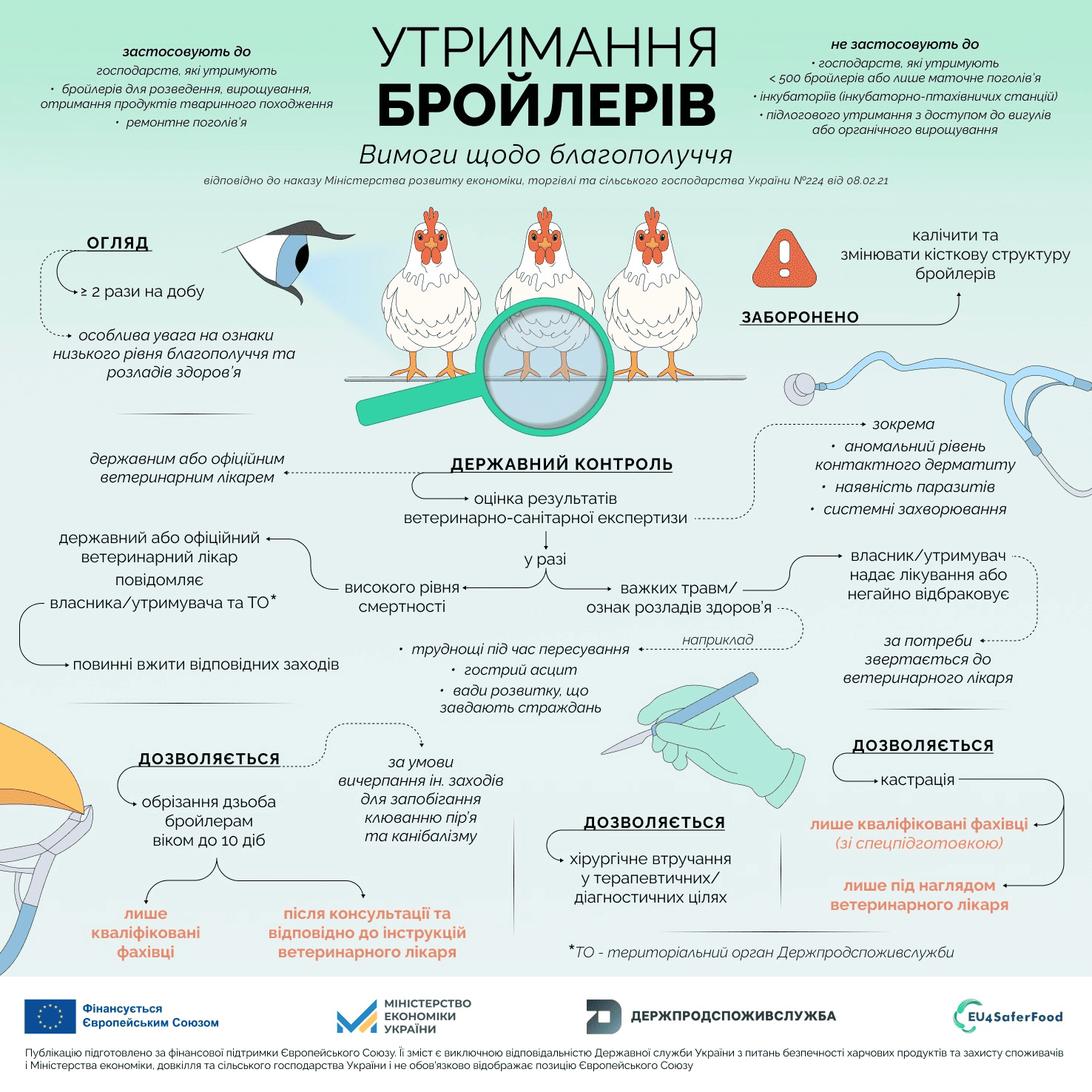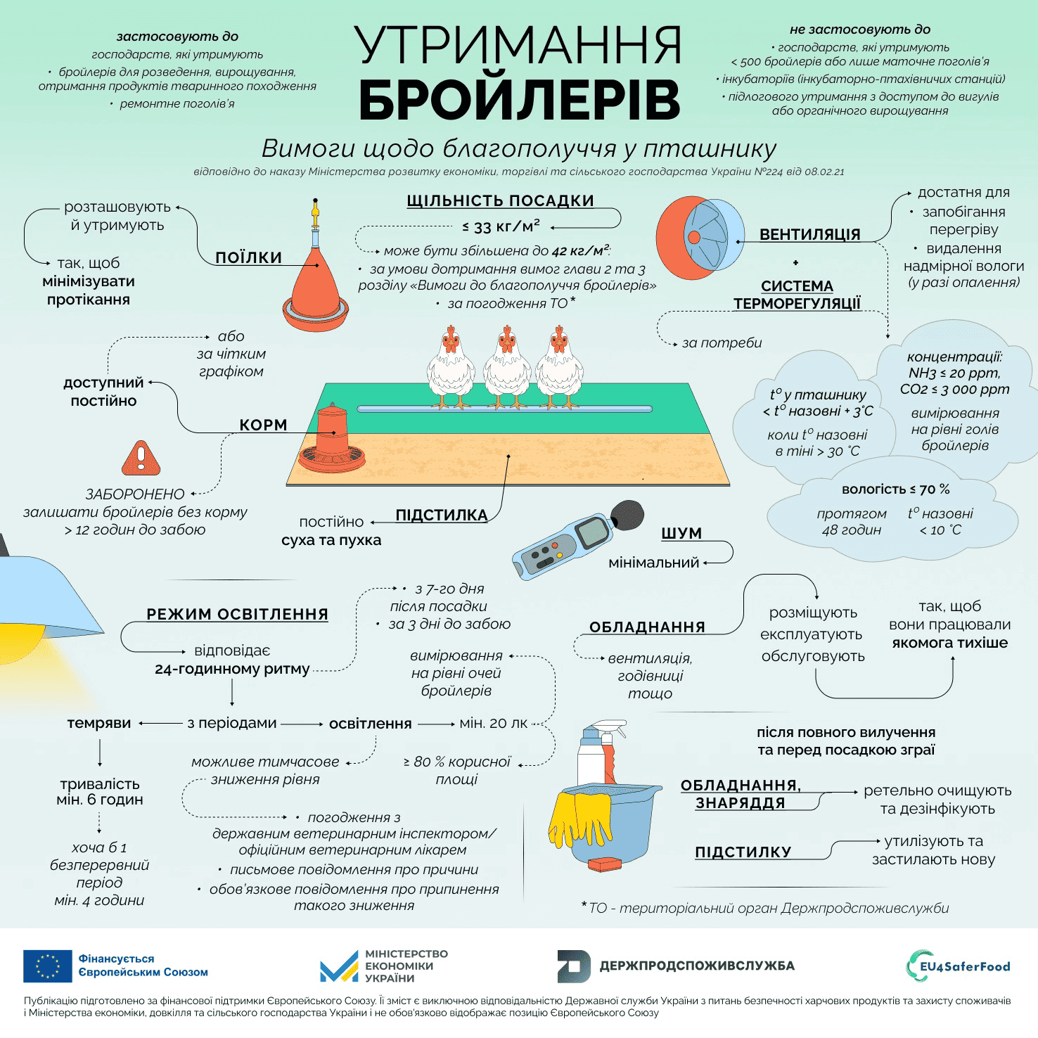 Спільно з Міністерством економіки, довкілля та сільського господарства України та європейським проєктом EU4SaferFood розроблено інфографіки, де коротко показано вимоги щодо благополуччя бройлерів під час їх утримання.