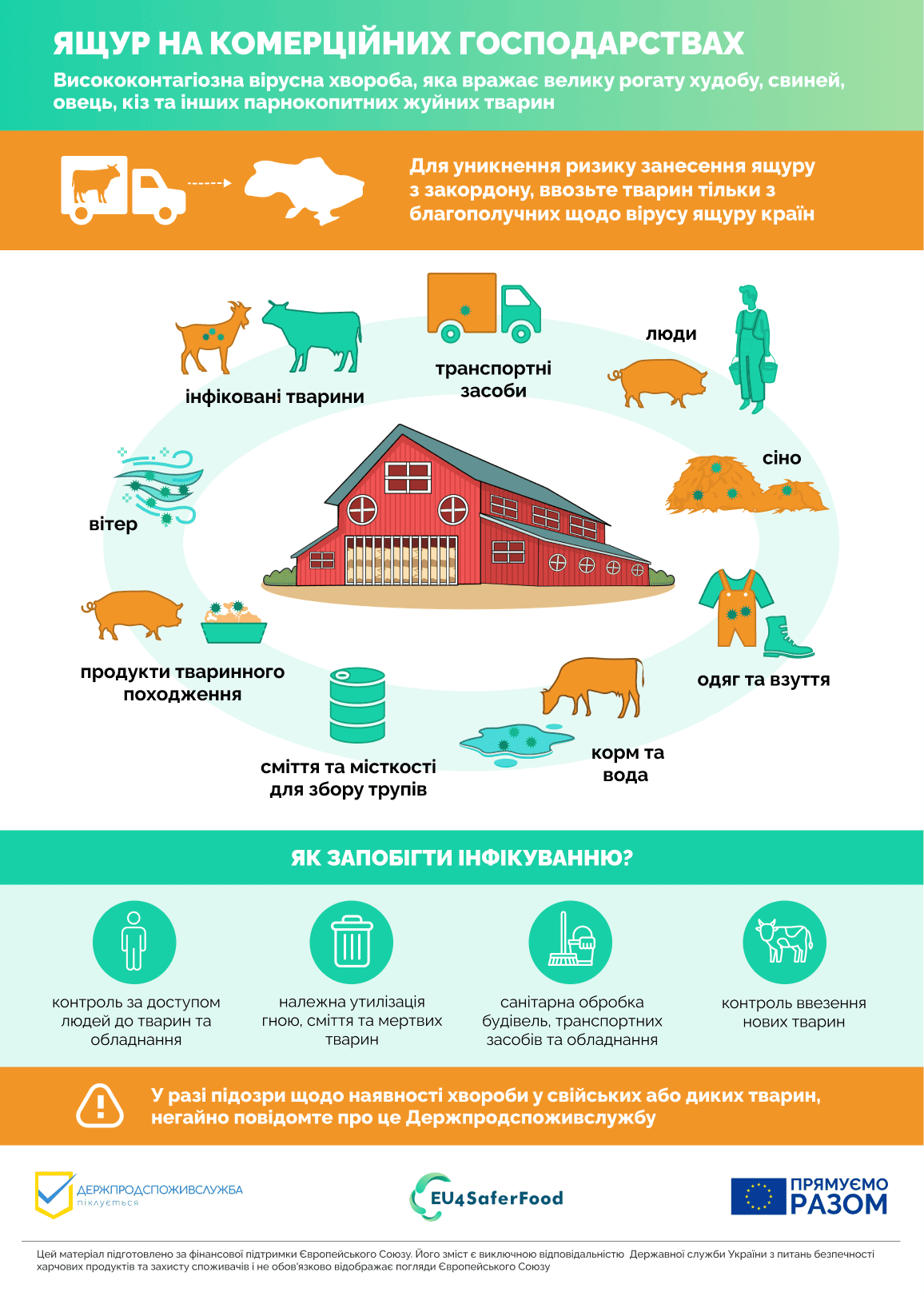 У спільній з європейським проєктом EU4SaferFood інфографіці наочно зображені всі можливі шляхи зараження ящуром.