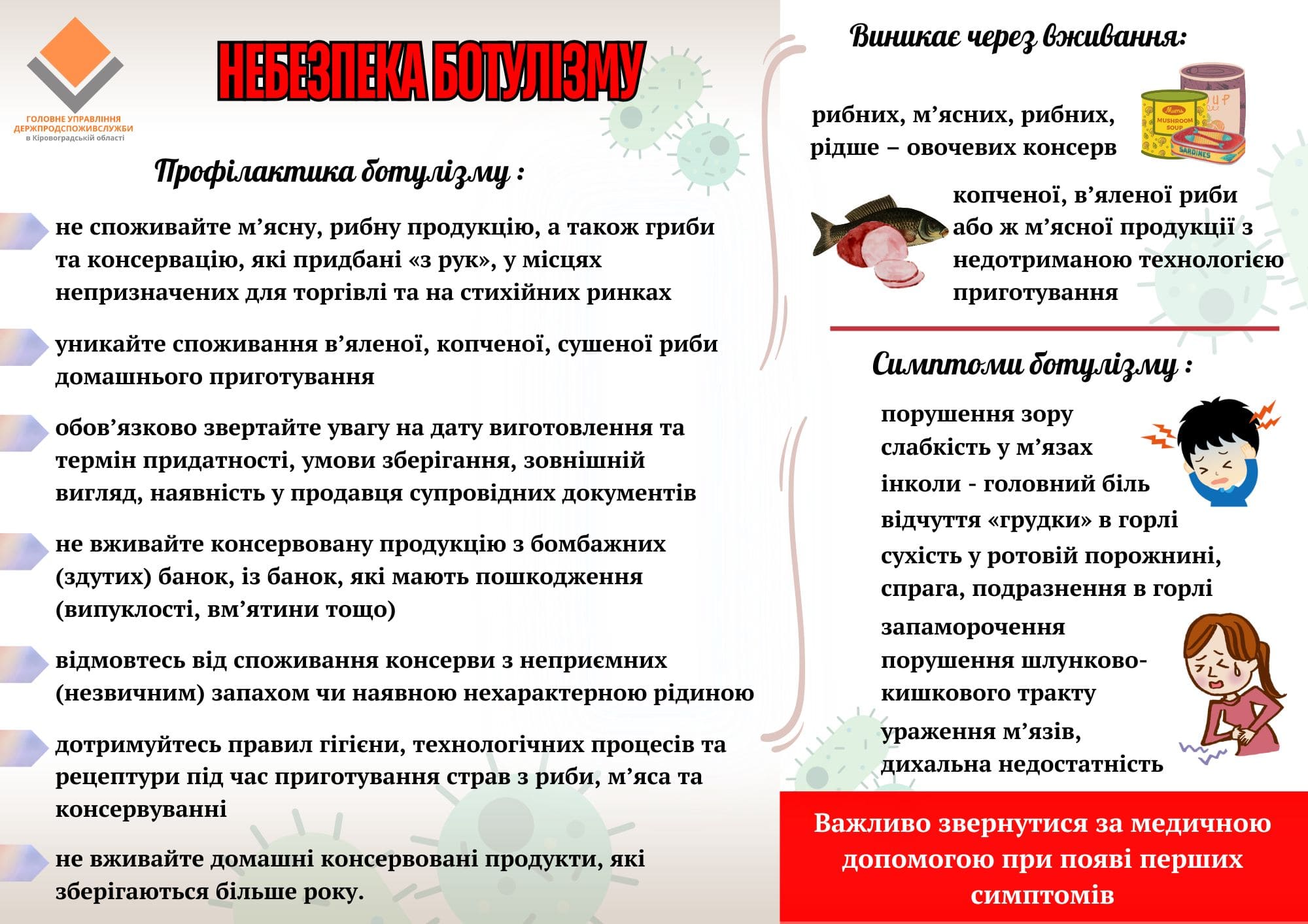 Нещодавно до комунального підприємства «Полтавська обласна клінічна інфекційна лікарня Полтавської обласної ради» потрапила жителька м.Світловодськ Кіровоградської області з підозрою на ботулізм. Наразі потерпіла проходить лікування в медичному закладі. Також проводиться санітарно-епідеміологічне розслідування даного випадку. Попередньо захворювання пов’язують із вживанням риби в’яленої, придбаною на ринку у сирому вигляді та приготовленою власноруч в домашніх умовах.
